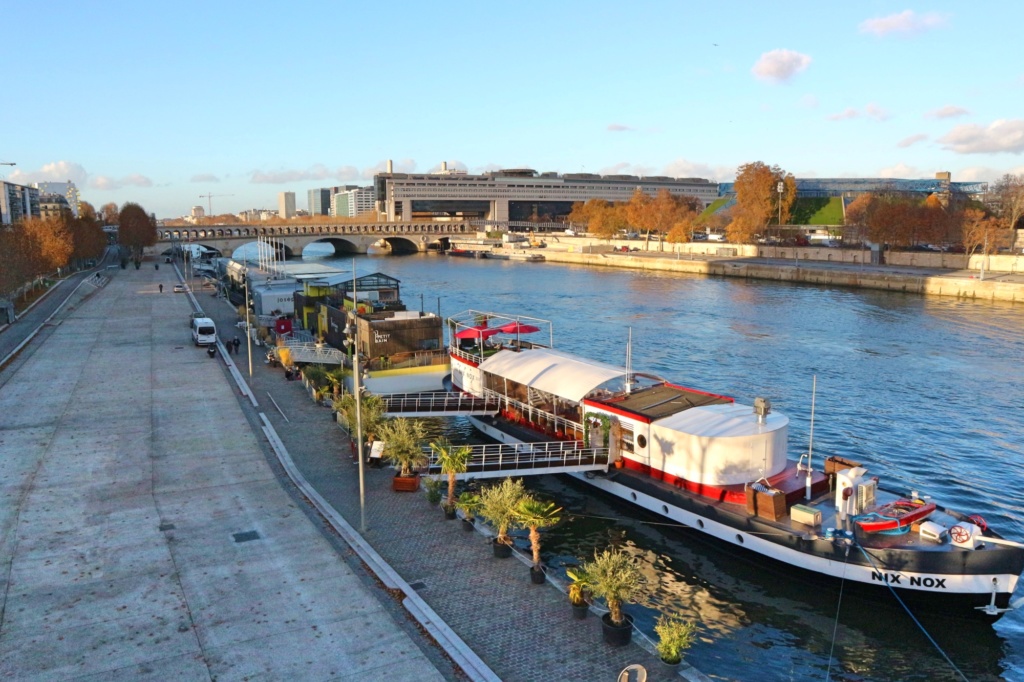 Of course some of the most romantic views of Paris are of the Seine and the view of the river from the 13th district is no exception. In my opinion, the best place to admire it from this part of the city is from the Passerelle Simone de Beauvoir. The newest of the Paris’ 37 bridges dating to 2006, the footbridge was designed by Feichtinger Architectes and aptly constructed by the Eiffel company (yes, the famous engineering company still exists!). I’m fond of this bridge for a few reasons, the first being that it has a great view of the Pont de Bercy where métro line 6 snakes along every few minutes. It also has a great bird’s eye view of the riverbanks, now pedestrianized and home to a collection of houseboat bars… including the below!