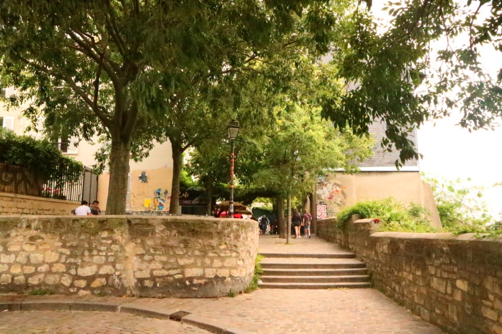 Tucked away behind the overcrowded and touristy Place du Tertre, is the much much less visited Place du Calvaire. Located between the vine laden restaurant Chez Plumeau (gorgeous in spring) and the Dali Museum (whose signs you can follow to locate it), the little square has some romantic benches to cuddle on as well as a wall to perch on. These overlook the city, buildings of Montmartre and some sneaky views of the Eiffel Tower in between the buildings to the bottom right of the vista. It’s been known to instigate romance… and even marriage proposals!