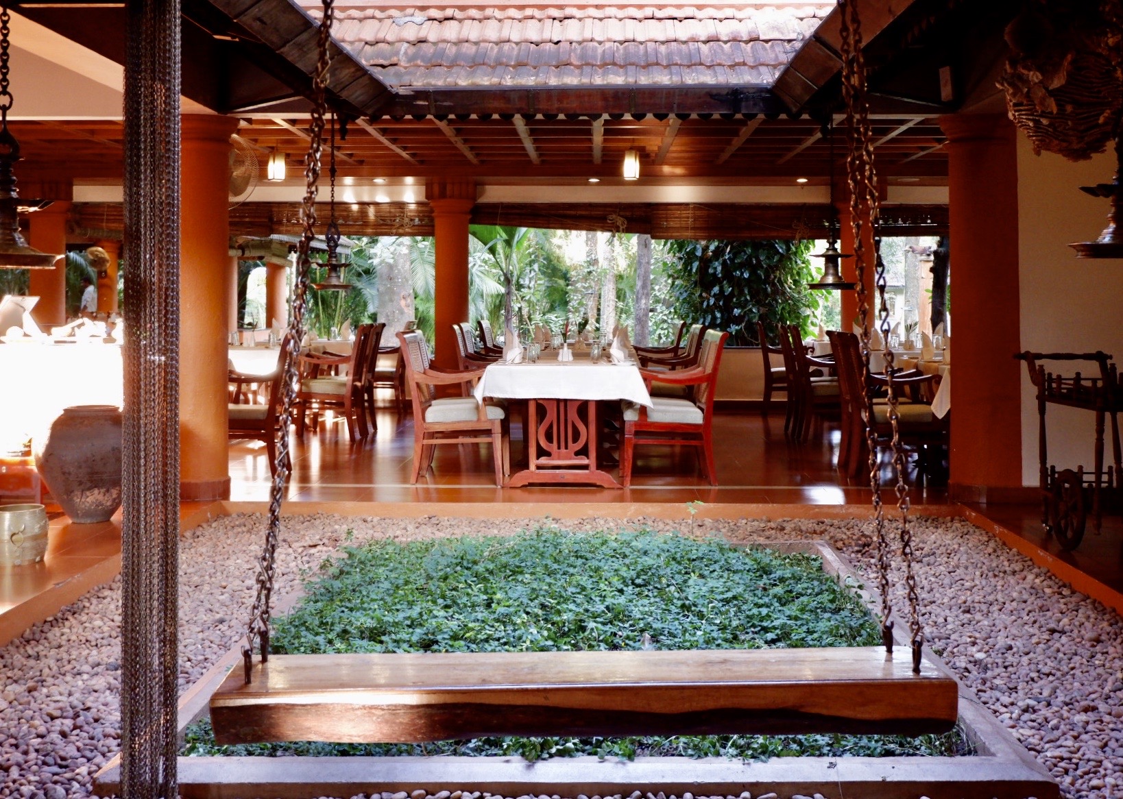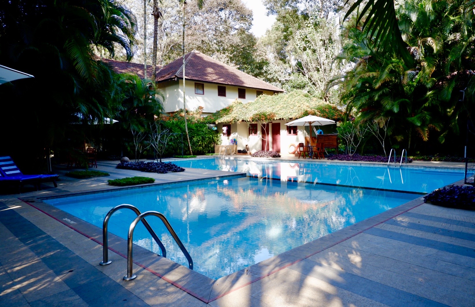 High up in the hills of Kerala, Thekkady is the gateway for exploring this gorgeous and polution-free part of India. The area’s rolling hills are dotted with spice plantations, pristine forests and the protected natural parks. Greenwoods Resort perfectly embraces this natural context due to its location but also its commitments to the environment. The hotel offers all the conveniences of town at the foot of its gates, yet it sits above town nestled within mature trees and greenery. Therefore, you can savor Thekkady’s splendid nature, complete with beautiful views and nature sounds, right from the property. There is a wonderful pool and various sitting areas around the grounds, including large hammocks that can fit two!