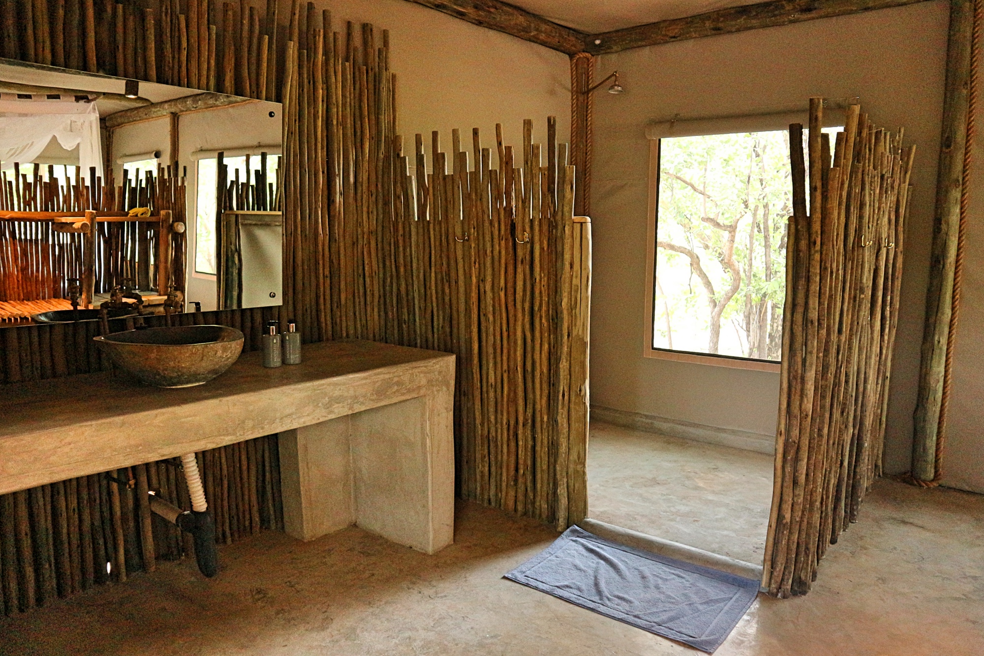 The lodge has 10 luxury “tents,” well spaced out from each other and surrounded by bush trees. Not exactly tents in the traditional sense of the word, the custom designed rooms have tented walls with large mesh “windows” and a metal roof. This gives you the feeling of being completely immersed in nature. Since the lodge is approximately 3 kms in from the road, the only noises you’ll hear are the chirping birds in the morning and possibly some larger animals as indicated above (don’t worry, it’s totally safe!). The spacious rooms have two ¾ beds beyond which are creatively separated from the en-suite bathroom by a section of wooden poles. Each room has its own private deck where you can sit and take in the sights and sounds of the lodge’s beauty and wildlife.