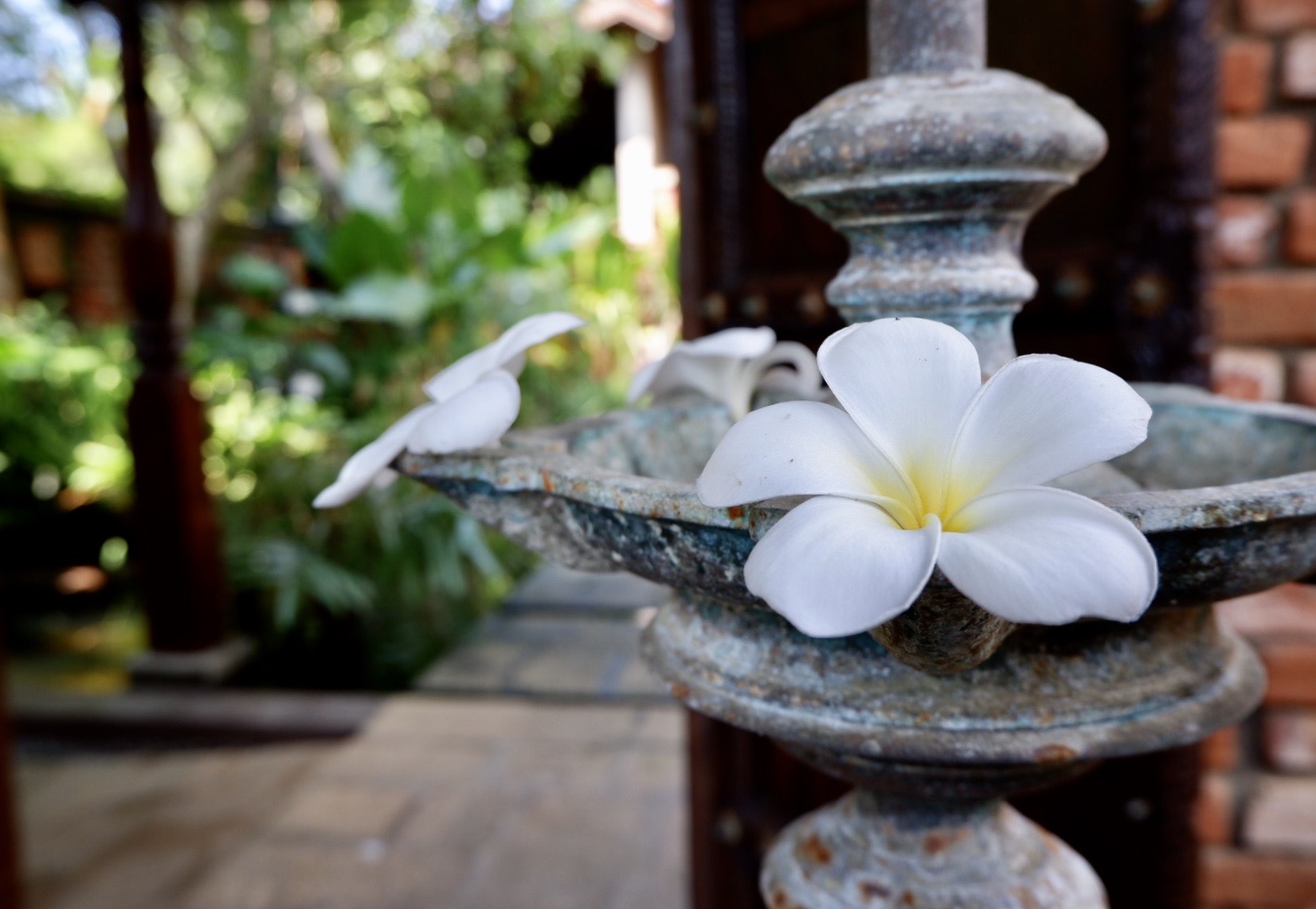 The Reef’s seven suites are spacious and luxurious, while also being intimate. Two of these are found in the Plantation House and four are ocean suites and the Lily Pond Suite, where we stayed, is tucked away from the others, hidden behind a wall and vegetation. The suite has a small garden with a table and chairs (where you can have private romantic dinners). You access the suite pavilion via stepping stones over a small waterlily pond and its resident tropical fish. You’ve then reached a small shaded veranda with a whimsical antique swing chair and some outdoor furniture. The romantic ambiance flows inside where you’ll find a vast room with cathedral ceilings lined with traditional terracotta tiles from Kerala, India. The room features an enchanting four-poster canopied bed, built for the British Raj and their families in the mid 1800s and am ample sitting area with elegant furnishings. A large dressing room leads towards the opulent bathroom where you can choose to bath in a hand-carved granite bathtub (which could fit two), a deluxe rain shower protected by a polished granite shower screen or an outdoor shower amidst plants and flowers.