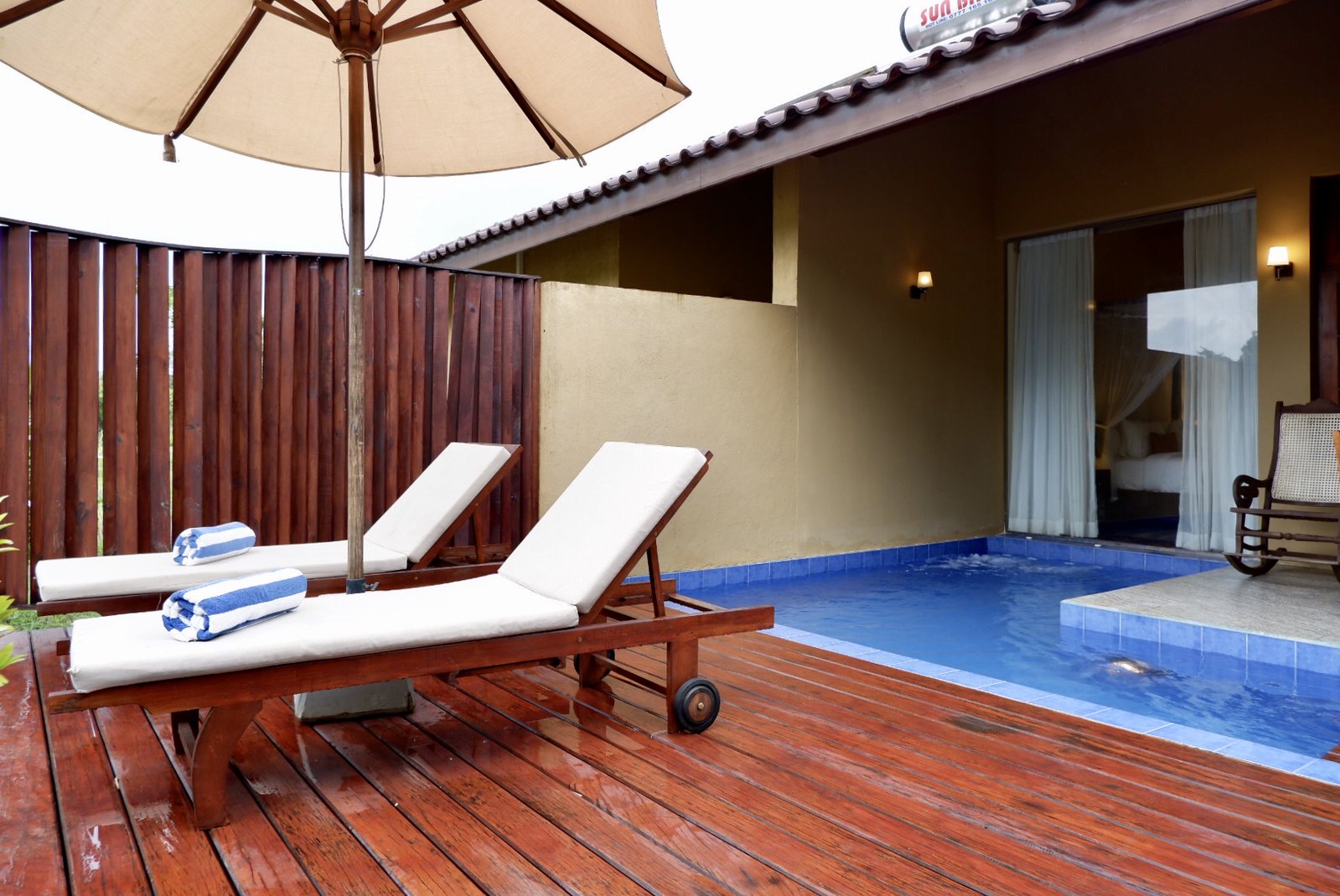 The rooms are distributed in cottage buildings which are well spaced out in a semi-circle around the main pavilion. Each room is named after an ancient Sigiriya king, which is a nice touch. They are accessed via a small bridge, something that also adds to the romantic allure. There are four categories of rooms: Superior King Deluxe, Superior Twin Deluxe, Premium Deluxe and Grand Deluxe. Superior King Deluxe and Superior Twin Deluxe rooms have a Jacuzzi tub, which is the ideal place to soak your weary bones (with your loved one) after scaling Sigiriya and Pidurangala Rock. Alternatively, you may want to splurge for a Premium Deluxe or Grand Deluxe room as these have their own private plunge pool and deck with sun beds. All rooms have a private veranda, an indoor sitting area, deluxe toiletries, bathrobes and slippers, flat screen TV with 50+ satellite channels and complementary tea/coffee facilities and non alcoholic beverages in the mini-bar.